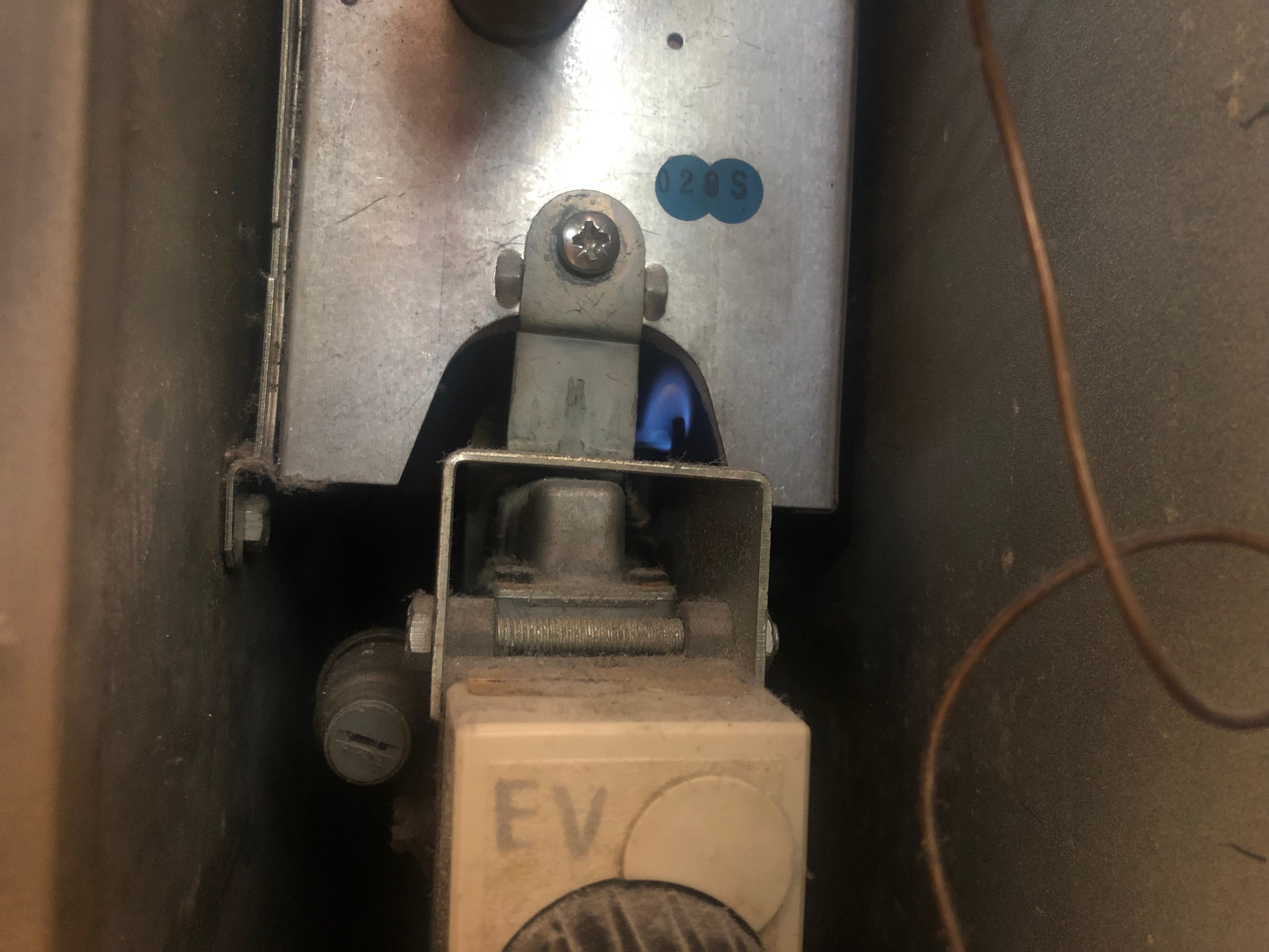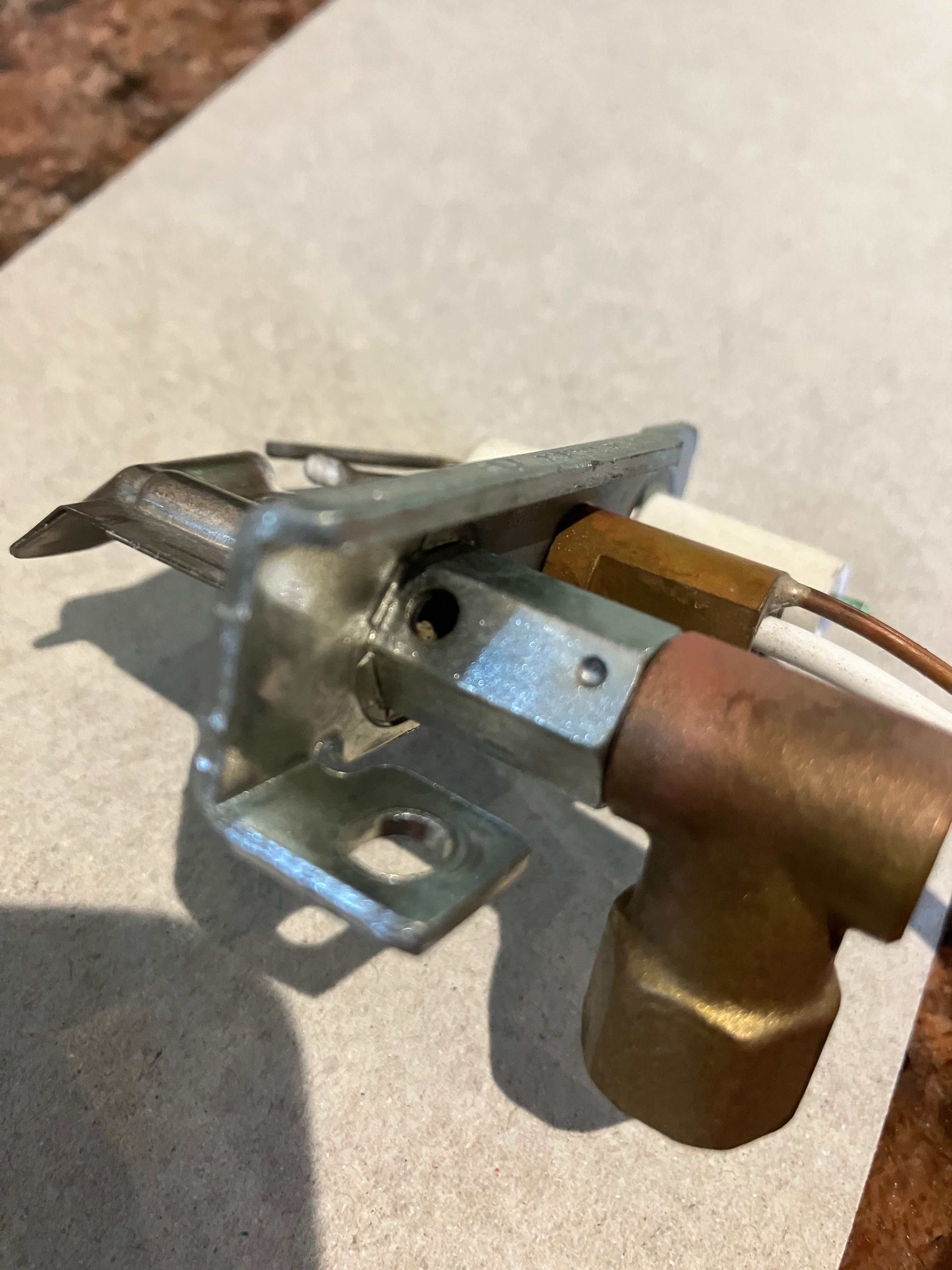 Here is the same pilot assembly, after blowing out and clearing the dust and fluff from the air hole. The flame will now burn steadily and solid blue in colour
