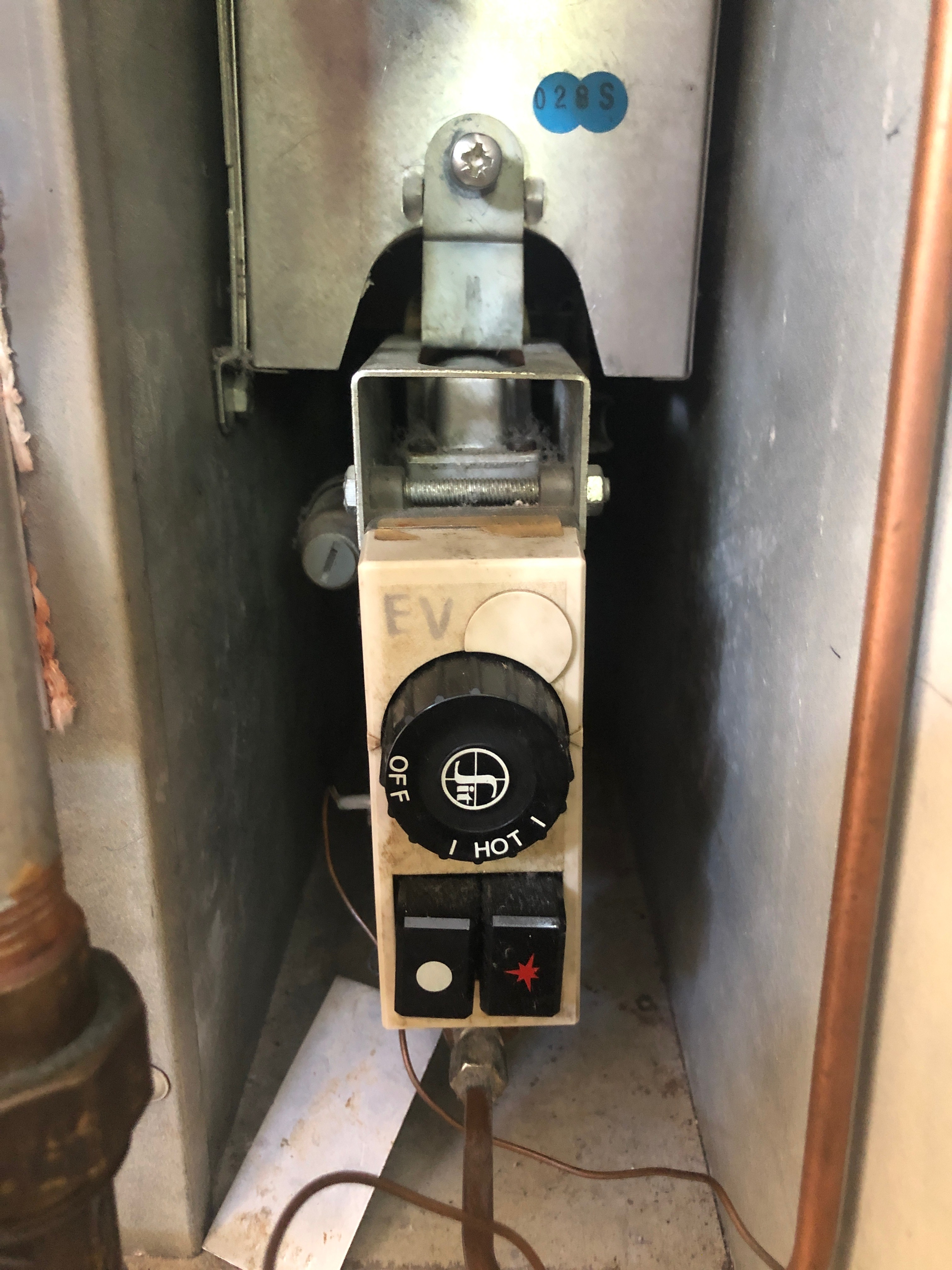 The whole gas control valve on a Janus 3 - showing the button with the spark symbol for re-lighting the pilot flame, and the ‘Off” button with the white dot. Also the temperature control dial. Rotate it anti-clockwise to raise the water temperature
