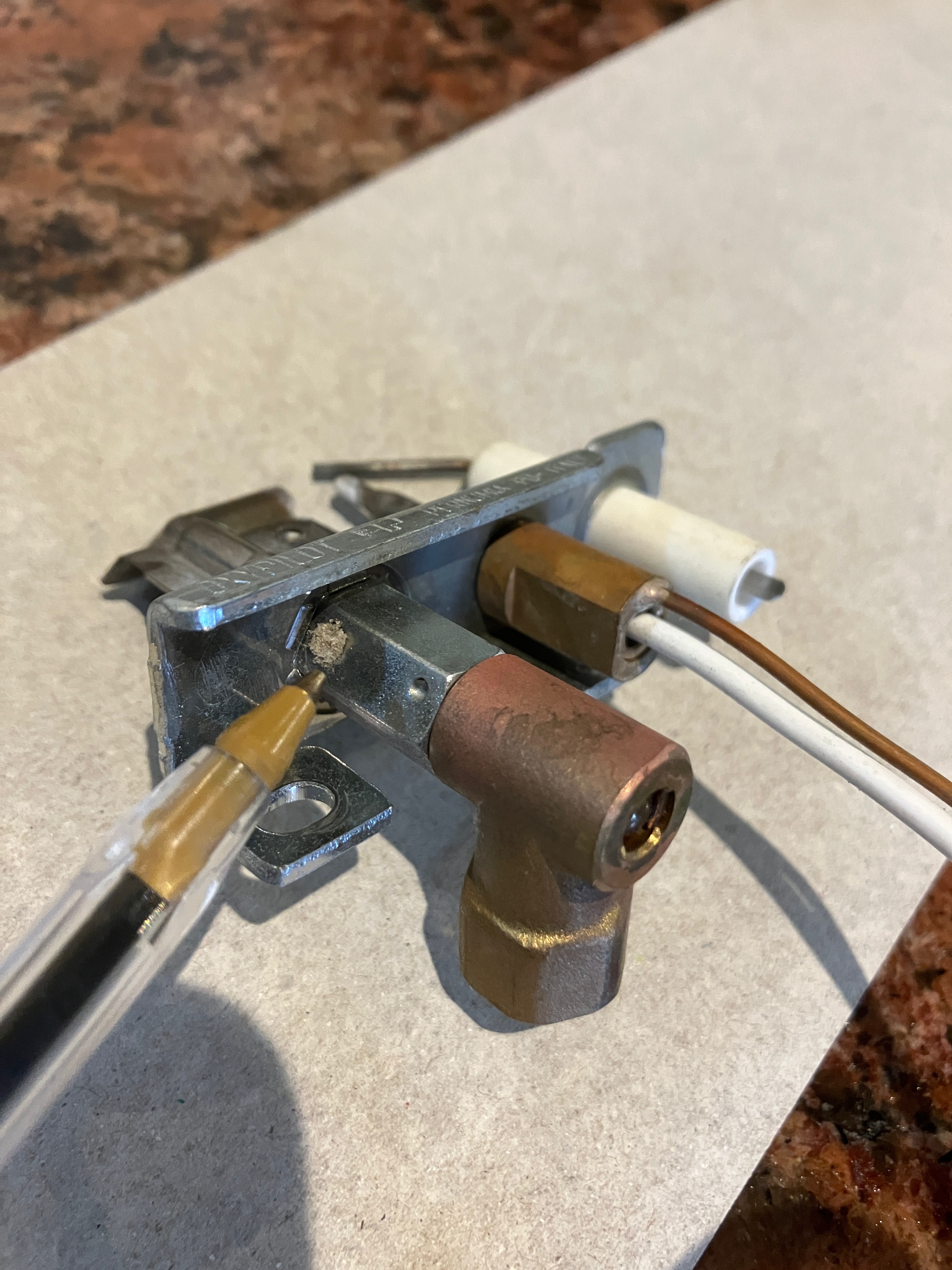 Pilot assembly removed from boiler, showing the tiny air hole (port), blocked with fluff. I’m pointing at the hole with my pen. Fluff causes the flame to burn yellow and blow out easily