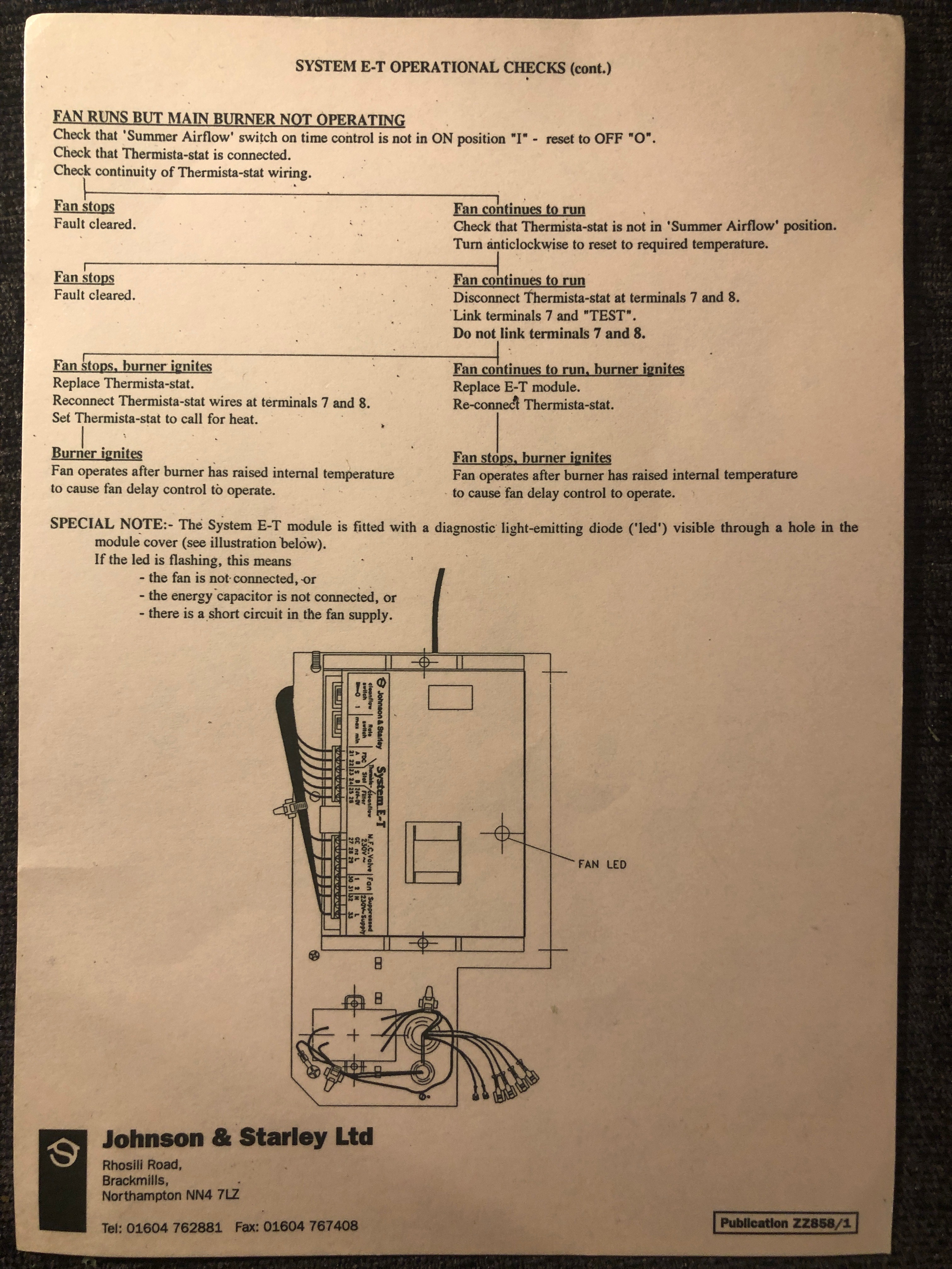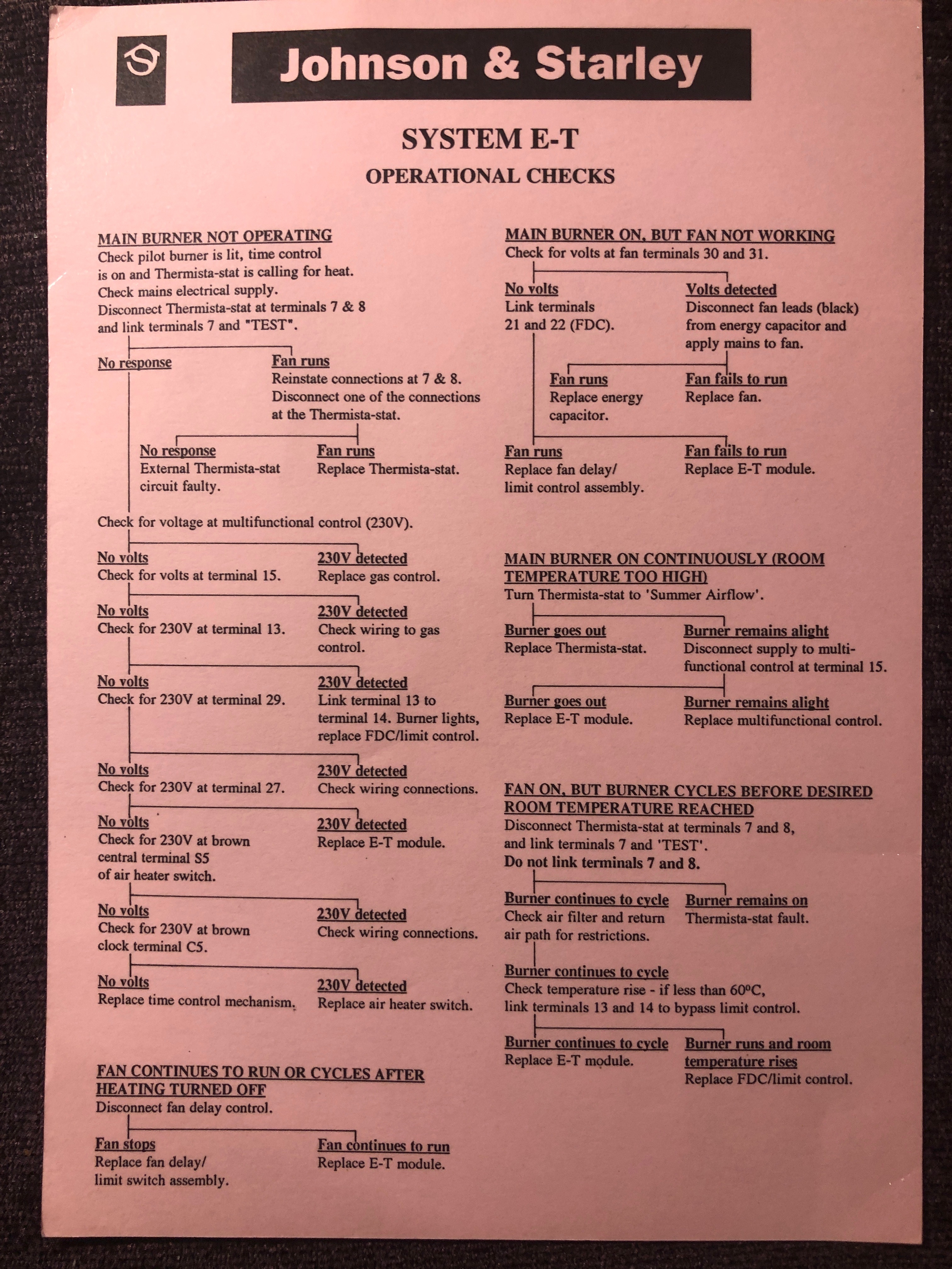 P.S. I have just found a System E-T fault tracing chart given to me by Johnson and Starley many years ago when I did a training course there. A pink laminated A5 document which I photographed and include below. (Hopefully J&S will not mind me including it here.) Zoom in to read the detail.